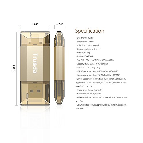 -. Binding : Personal Computers -. Brand : Trusda -. Department : unisex-adult (lage only) -. Feature : Fast Performance: Directly plugs into your lightning port and USB port; experience up to 90 MB/s reading and 40 MB/s writing speed with USB 3.0 port. Lightning Port Speed: up to 20MB/s reading speed, 15MB/s writing speed / Easy to-Use: plug and play,Cap design with integrated loop makes it easy to attach to key chains, backpacks and etc. / Convenient APP Access: Copy and browse all files with the FREE iOS app; directly watch movies and listen to music stored on the drive. / Compatible with iPhone6s / 6splus / 6 / 6plus / 5/ 5s / iPod4 / iPad4 / iPad mini / iPad Air / iPad Pro .Fully compatible with windows XP /Vista / 7 / 8 / 10 / Mac OS / What You Get: 1x Trusda iPhone USB to Micro USB Adapter, our worry-free 12-month warranty and friendly customer service. -. HardwarePlatform : mac -. Label : Trusda -. Manufacturer : Trusda -. Model : T301 -. MPN : U-A301 -. PackageQuantity : 1 -. PartNumber : U-A301 -. ProductGroup : PC Accessory -. ProductTypeName : FLASH_MEMORY -. Publisher : Trusda -. Studio : Trusda -. Title : Trusda iPhone USB 3.0 Flash Drive with Lightning Connector [Apple MFI Certification] intelligent storage Memory Expansion for iPhone iPad iPod Computer