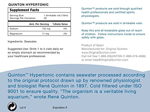 Studio : Quicksilver Scientific, LLC Publisher : Quicksilver Scientific, LLC Binding : Health and Beauty Product Description Quinton Hypertonic is pure seawater harvested from protected plankton blooms following the protocols of Frenchman Rene Quinton (1866-1925). Hypertonic is a good way to start your protocol if you are generally healthily. Many Hypertonic users report positive results switching to Isotonic after several months and back to Hypertonic occasionally to regulate their system. After trying both, many just "know" which one they need when. *These statements have not been evaluated by the Food and Drug Administration. This product is not intended to diagnose, treat, cure or prevent any disease. 0 |