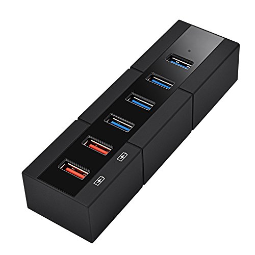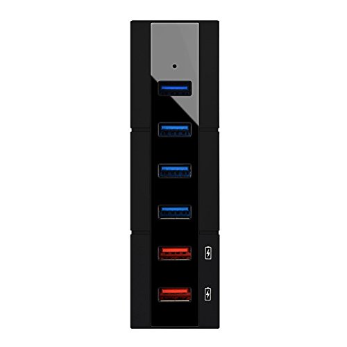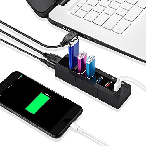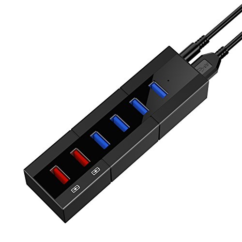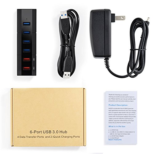 USB Hub, KOOTION 6-Port USB3.0 Hub Including 4 High Speed USB3.0 Data Transfer Ports and 2 BC1.2 Smart Charging Ports with Power Adapter ( 5V / 3A ), Black