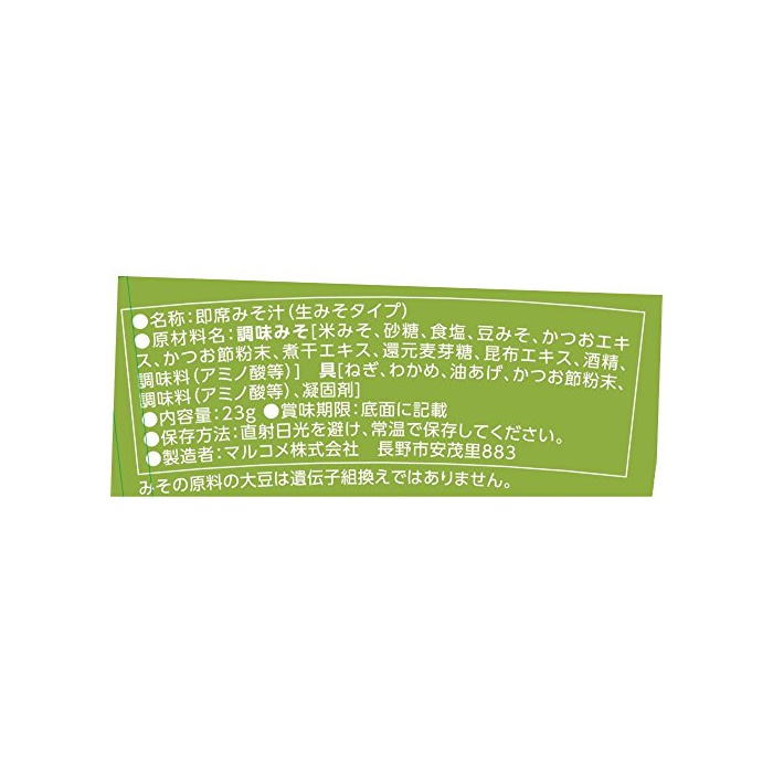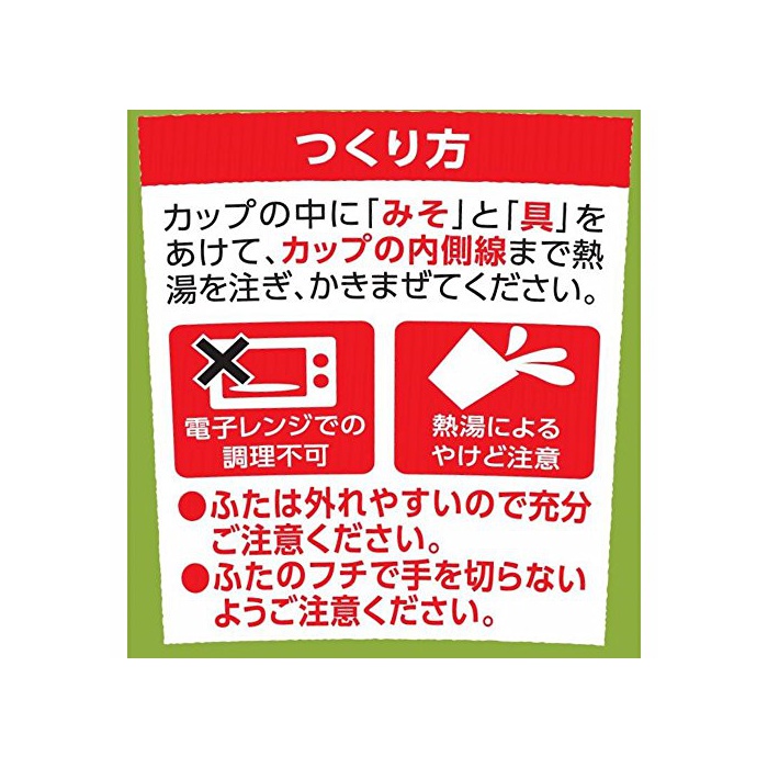 원재료:조미 된장[미 된장,설탕,식염,두된장,가다랭이 엑기스,가다랭이절 분말,자간엑기스,환원 맥아당,다시마 엑기스,주정,조미료(아미노산등)]구[파,미역,유주고,가다랭이절 분말,조미료(아미노산등)고, 응고 제]