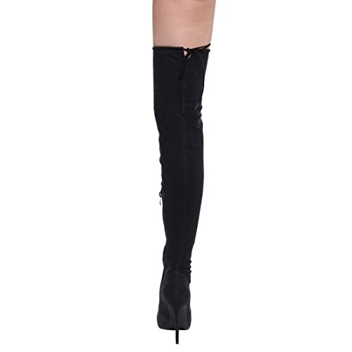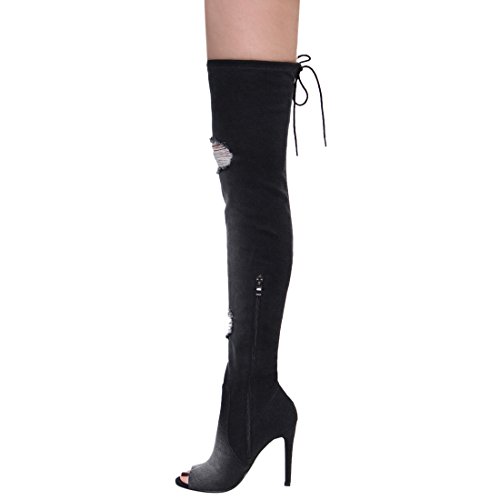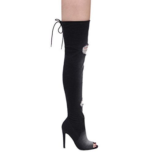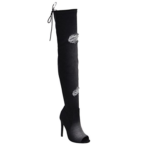 X2B FG64 Women's Distressed Peep Toe Over The Knee Stiletto Heel Denim Boots