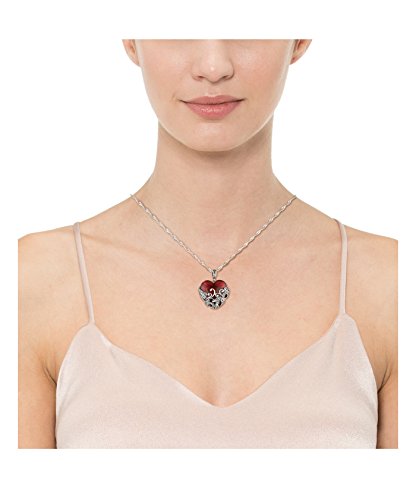 Sterling silver necklace featuring heart-shape glass pendant encased in marcasite-accented filigree
