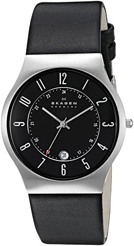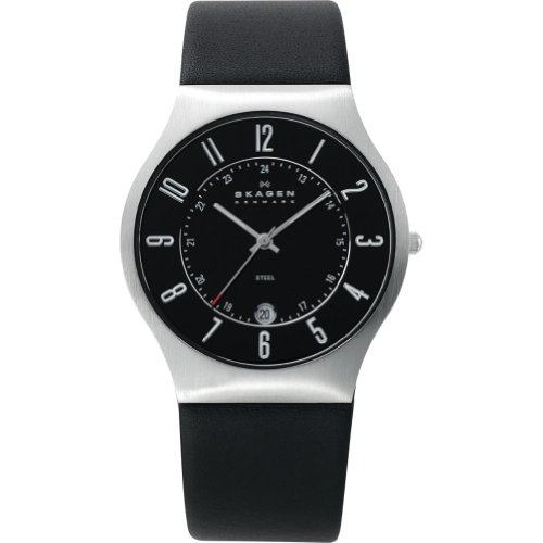 Product Description A distinguished, modern style from the fine jewelry maker Skagen. This men's watch features a wide black leather strap and silvertone stainless steel round case. Black round dial with subdial, date window, logo and numerical indices. Quartz movement. Water resistant to 30 meters. Ten-year limited warranty. 0