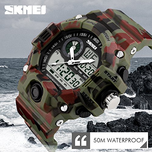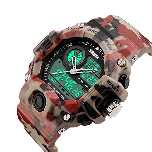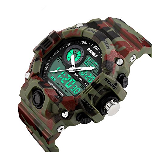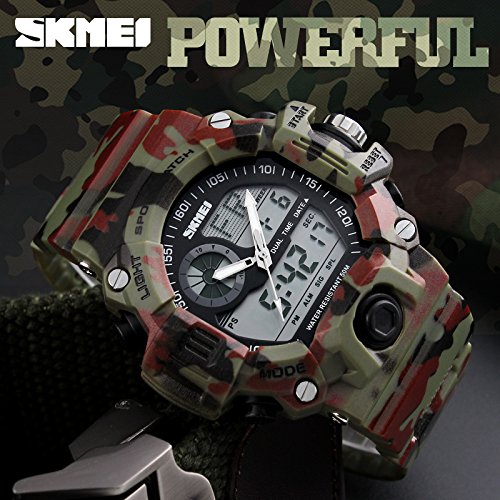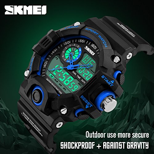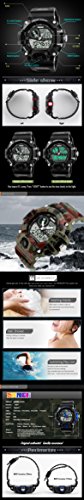-. Feature : Shockproof + Extreme Gravity Defense: Super conceptual design satisfy strict demands athletes training.You can wear the watch for a variety of outdoor sports,such as football,rock climbing,simulated military game. Secure! / Depth Waterproof:This watch can meet your daily use waterproof.164ft water resistant,feel free to wear the watch when you are washing hands,showering,swimming and diving. Convenient! / Hight Quality Meterial: Japanese Movement,Japanese battery which can provide the watch strong power.Execllent ABS plastic case and stainless steel case back which enable the watch to be tough and durable.Highly transparent resin glass is extemely hard and pressure-tolerant.Grameny improted PU resin strap is soft and comfortable and environmental friendly. / Fashion Creative:Fashion sport model,dual time sports watch let you easily grasp the off-site time. / Function:2 time,Chrono,Alarm,Date,Week, EL light