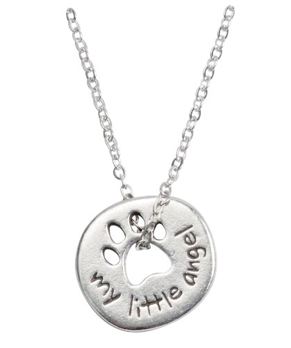 Studio : Rockin' Doggie Publisher : Rockin' Doggie Binding : Misc. Product Description This paw necklace features an organic shaped disc with a cut-out paw and inscribed my little angel". The dainty design is a simple and fun way to display your love for your dog. Made from 100% lead-free pewter. The design comes on an 18 inch cable chain. 11/16" H x 11/16" W. Made in the U.S.A. 0