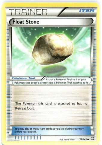 -. Binding : Toy -. Brand : Pokémon -. Edition : XY BREAKthrough -. Feature : A single individual card from the Pokemon trading and collectible card game (TCG/CCG). / This is of Uncommon rarity. / From the XY BREAKthrough set. -. IsAdultProduct : 0 -. ItemPartNumber : 137/162 -. Label : Pokemon USA, Inc. -. Manufacturer : Pokemon USA, Inc. -. MPN : LYSB016VKBXIU-TOYS -. PackageQuantity : 1 -. PartNumber : LYSB016VKBXIU-TOYS -. ProductGroup : Toy -. ProductTypeName : TOYS_AND_GAMES -. Publisher : Pokemon USA, Inc. -. Studio : Pokemon USA, Inc. -. Title : Pokemon - Float Stone (137/162) - XY BREAKthrough