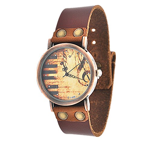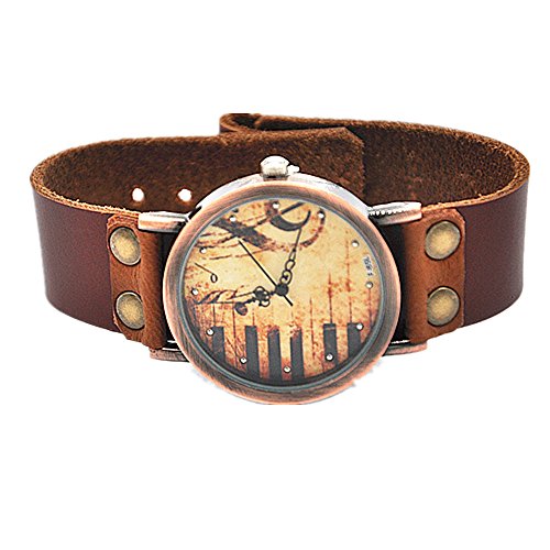 - 2.Vintage alloy dial with stainless steel back cover, clearly hour mark display, easy to read time. music sign and piano keys display dial retro, literary and artistic, the brown watch strap is simplicity.