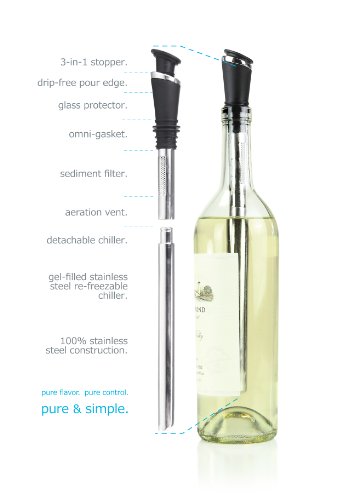 - includes a stainless steel pourer, sediment filter, re-freezable gel filled chiller & silicon bottle stopper.