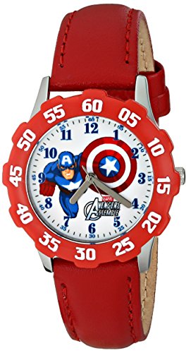 -. Binding : Watch -. Brand : Marvel -. Color : Red -. Department : boys -. EAN : 0843231078277 -. Feature : Round Stainless Steel Watch with Marvel's Captain America character on dial. / Meets or exceeds all US Govt requirements and regulations for Children's watches. / Recommended for Ages 7-12 years old. / Accurate Japanese Quartz movement, scratch resistant mineral crystal, leather strap. / Water Resistant to 99 feet: withstands rain and splashes of water, but not showering or submersion. / 1 Year Limited Manufacturers Warranty -. Label : Marvel Comics -. Manufacturer : Marvel Comics -. Model : W001554 -. MPN : W001554 -. PackageQuantity : 1 -. PartNumber : W001554 -. ProductGroup : Watch -. ProductTypeName : WATCH -. Publisher : Marvel Comics -. Studio : Marvel Comics -. Title : Marvel Kids' W001554 Tween The Avengers Captain America Analog Display Analog Quartz Red Watch -. UPC : 843231078277
