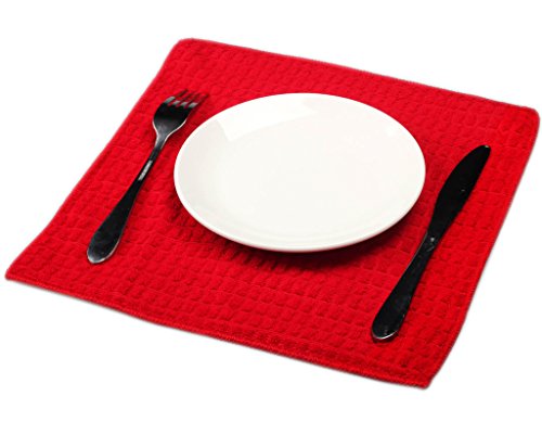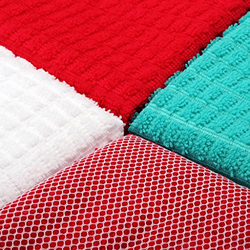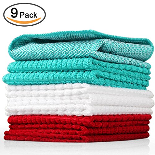 Kleanner SUPER PREMIUM Microfiber Kitchen Dish Cloth Tea Towels With Poly Mesh Scour Side, Double Side Scrubber Rags Cloth, Size 12 x 12 Inch, 9-Packs ( Assorted Colors Red/Blue/White)