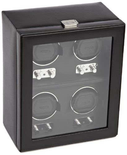 -. Feature : Dimensions: 10.75W x 6.5D x 13H in. / 4 winder modules / Black faux leather and grosgrain / Glass cover with latch closure / Chrome-finished hardware