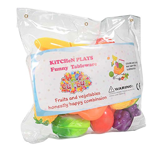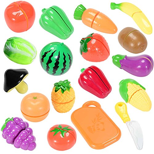 Includes 18 Pieces -- apple, pineapple, strawberry, orange, watermelon, banana, grape, tomato, carrot, mushroom, corn, kiwi, chinese cabbage, green pepper, red pepper, eggplant, chopping board and knife.