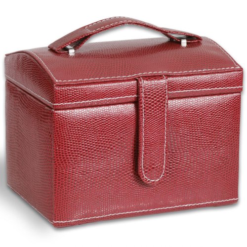 -. Feature : Faux snake-skin, red leatherette jewelry box / Dimensions: 6.0L x 4.75H x 4.5W inches (Small) / Features a built-in mirror and handle. Also features three compartments, bottom two compartments are pull-out drawers / Makes a great first jewelry box for any young lady / Jewelry and other accessories shown are for display purposes and are not included