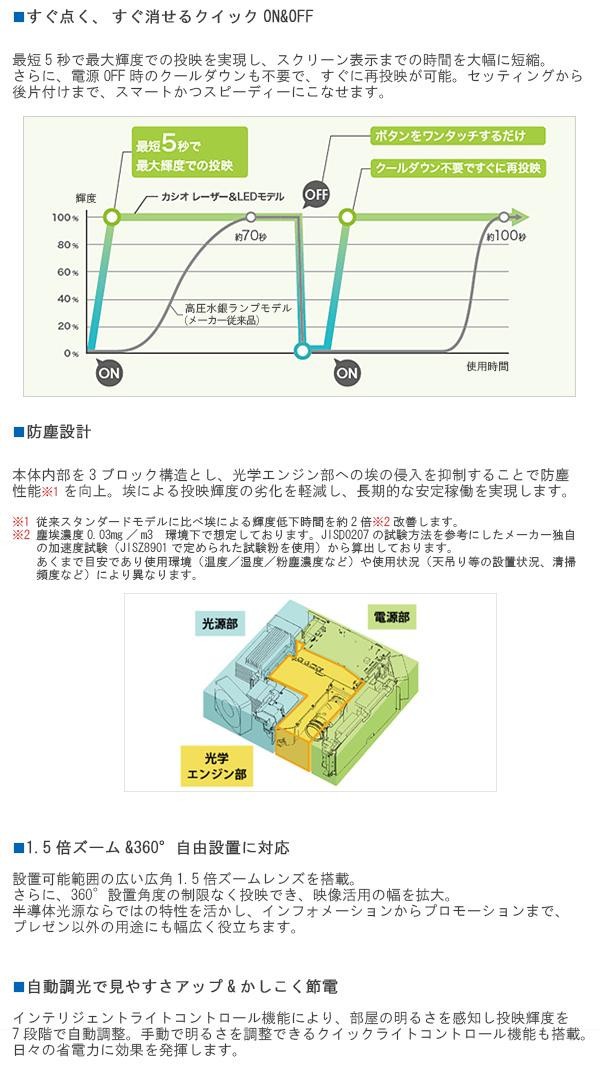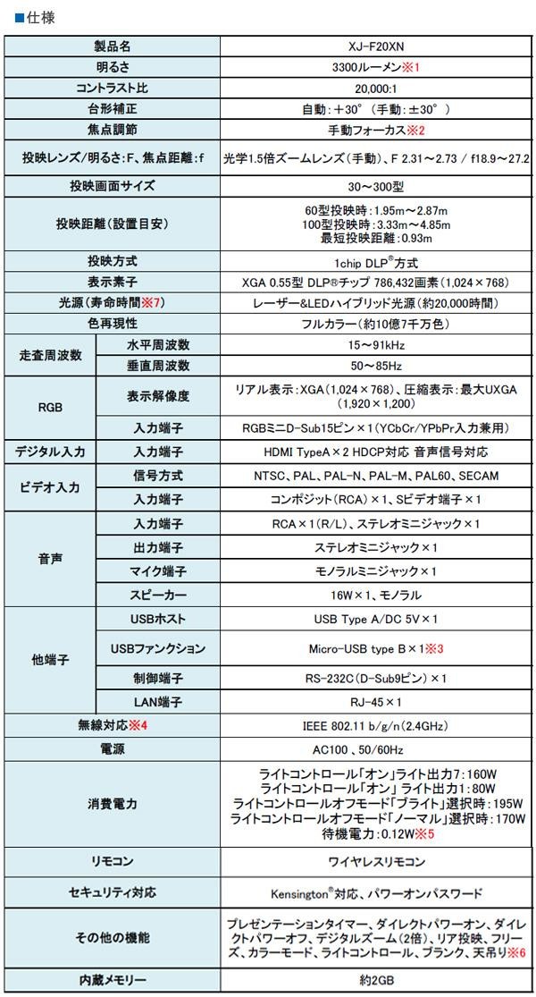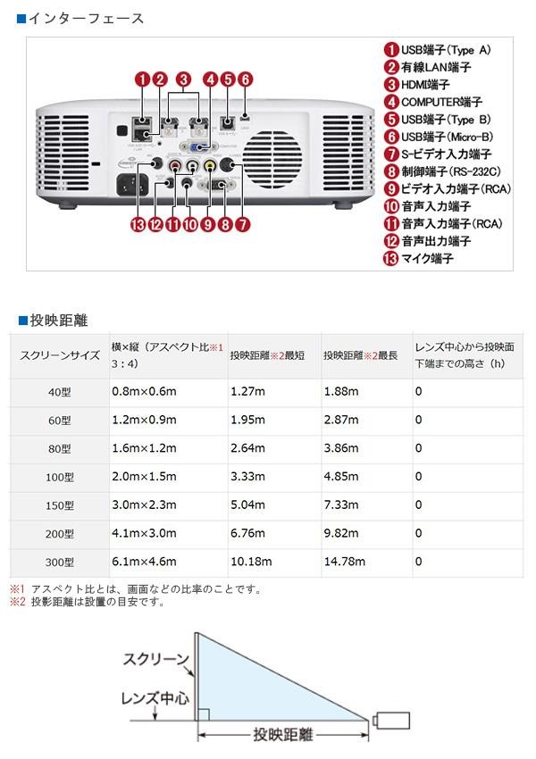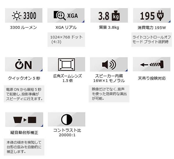 1.5倍ズーム&360度自由な角度に投映できる3300ルーメンの水銀ゼロモデル。部屋の明るさを感知し投映輝度を自動調節。日々の省電力に効果を発揮します。ネットワーク接続、USBメモリ対応。 |