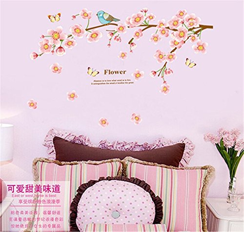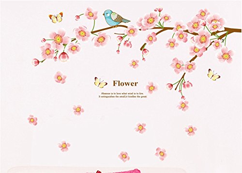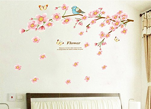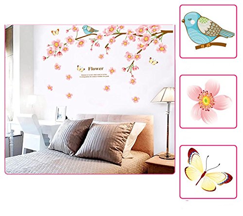 BIBITIME Pink Cherry Blossom Trees Birds Branches Floral Butterflies Wall Art Decals Decor Removable Sticker for Bedrooms Kids Room Living Room Dining Room,DIY Size: 55.12 43.31 IN