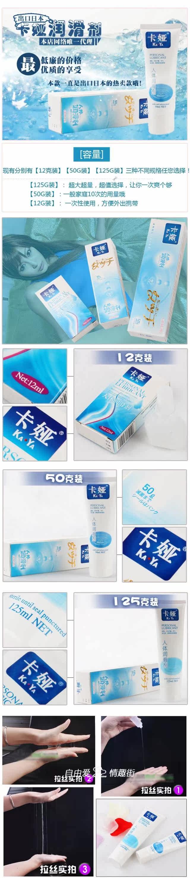 “卡娅”高效人体润滑剂,配方极其温和、色泽清澈纯正,不油腻,具有抗过敏性和不留有害残渣的特点。特别添加的有益成分,非常适用于年龄增长、工作压力及生活方式等因素而引起的女性分泌物减少、性生活不和谐等现象。增强女性阴户生殖道或肛道的润滑和弹性,使用倍感舒适无异物感.经常使用能改善女性性冷淡和无高潮症状.有普通常规型、芦荟滋养调节型、阴道修复型、热感催情型、冰极酷爽型、延时型等众多类型可供选择。