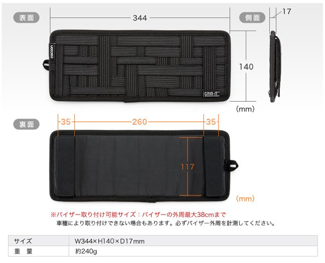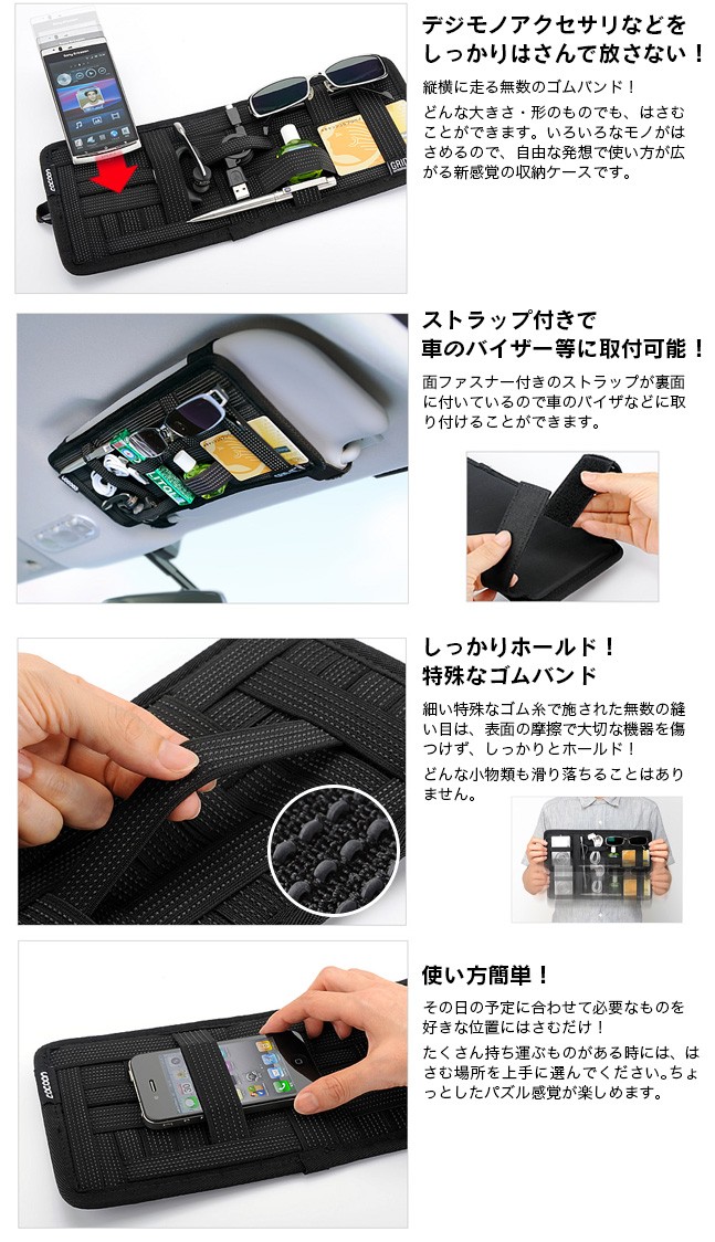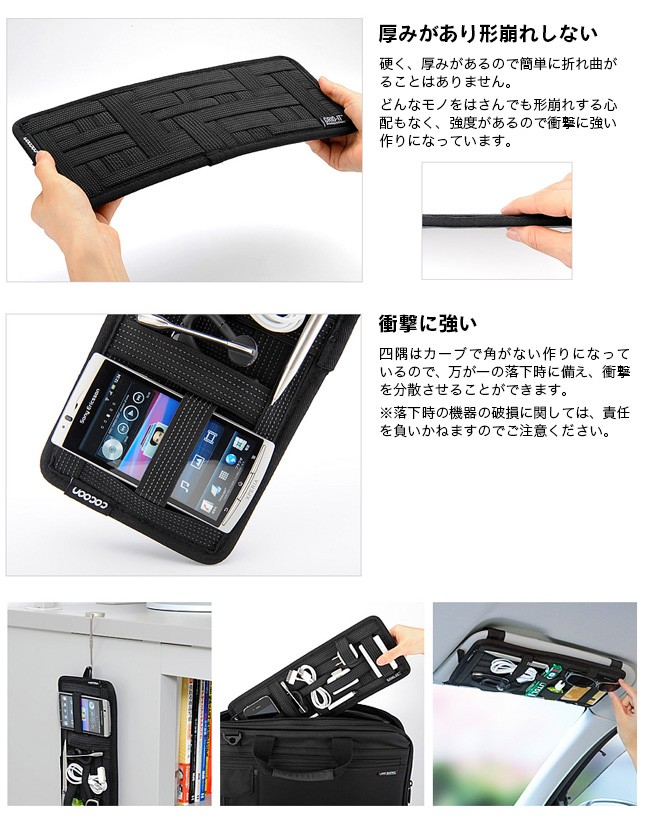 ・GRID-ITは、表面を通る無数のゴムバンドで小物をしっかり挟み込み固定する、全く新しいタイプのガジェット&アクセサリケースです。 ・どこに何を挟んでいるか一目で分かるので、すぐに取り出せます。 ・多くのゴムバンドが縦横に通っているので、たくさんの小物を収納することが可能です。 ・ゴムバンドの隙間の大きさは様々なので、小さいものからある程度の大きさのものまで、やり方次第で柔軟に収納することが可能です。 ・デジモノアクセサリから工具類、おもちゃ、化粧品などいろいろなものが収納でき、自由な発送で使い方が広がります。 ・ゴムバンドには無数の縫い目がゴム糸で施されており、ホールドしたものを表面の摩擦で傷つけません。 ・ゴムベルトがしっかり小物を固定するので、強く振っても反対にしても滑り落ちる心配はありません。 ・GRID-ITは硬く厚みがあるので、モノを挟んでも形崩れしたり折れ曲がったりしない、衝撃に強い作りになっています。 ・フックの通し穴が付いているので、使用しない時は壁や机の横に掛けておくことができます。 |