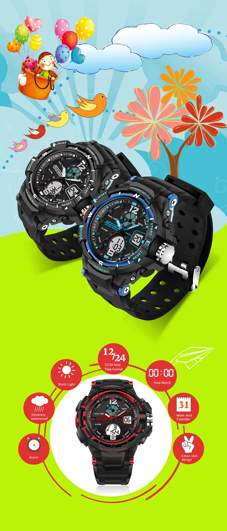 Feature:Water Resistant,LED display,Back Light,Complete Calendar,Shock Resistant,Diver,Chronograph,Auto Date,Alarm,Swim