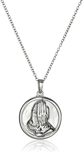 Rhodium Plated Sterling Silver Round Medallion Two Sided Serenity Prayer and Praying Hands Pendant Necklace, 18"