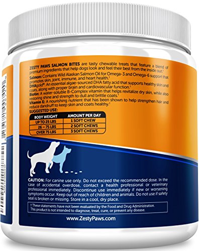 A HEALTHY TREAT DOGS LOVE - Zesty Paws Salmon Bites supplements are made with wild caught Alaskan Salmon Oil and Salmon Meal to provide Omega-3 and Omega-6 fatty acids (EPA and DHA) that help dogs of all ages, breeds, and sizes feel their best.