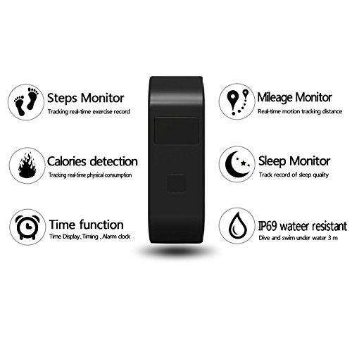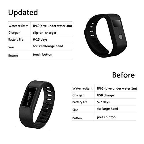 - Feature : IP 69 WATERPROOF DEGREE: use it when face ordinary life water, such as wash a hand or wear it in raining days, worry free from water splash, dive and swim under water 3m! / OLED SCREEN: displays the Time, Steps, Calories, Distance, Clock, Sleep Monitor, Alarm, Lower Battery, Charing and more, a useful pedometer and health monitor! / LAST LONG TIME: only needs about 2 hours for full charging, last about 6~15 days depending on how you use it, don¡¯t need to charge it every day! / BLUETOOTH 4.0: touch button easy to control, rechargeable battery with an Clip-on Charger included. / Attention: in 2015/11/3, this watch is updated to this new one! And this one cannot shutdown until it run out of battery.