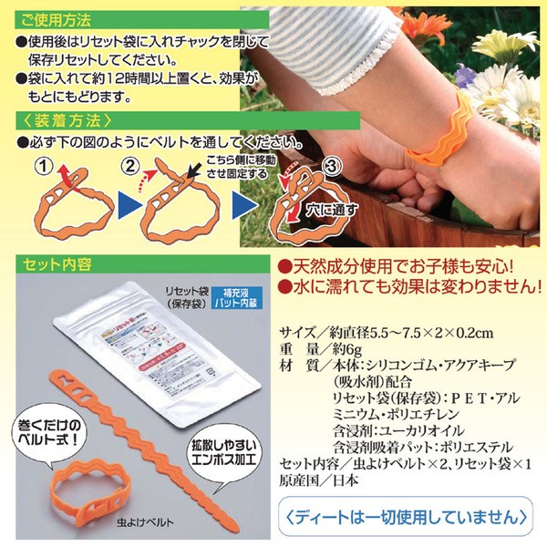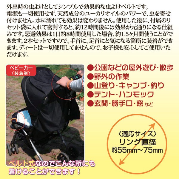 外出時の虫よけとしてシンプルで効果的な虫よけベルトです。電源も一切使用せず、天然成分のユーカリオイルのパワーで、虫を寄せ付けません。水に濡れても効果は変わりません。使用した後に、付属のリセット袋に入れて密封すると、約12時間後には効果が元通りになる仕組みです。忌避効果は1日約8時間使用した場合、約1.5ヶ月間使うことができます。2本セットですので、手首に、足首にと気になる箇所に装着ができます。ディートは一切使用してませんので、お子様も安心してご使用いただけます。