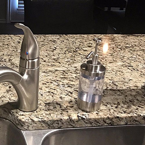 Great soap dispenser in the kitchen, bathroom, hotel. The clear section is plastic but with the Stainless steel top and bottom, it doesn't appear "plasticy" .The pump is great. The best thing about this dispenser is that soap doesn't run down the sides and leave a mess on the counter. This also means you don't waste soap like you do in many dispensers.