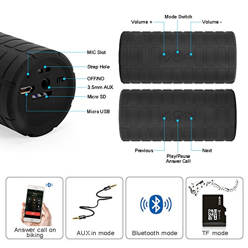 -. Feature : Plays Music via Bluetooth, MicroSD Card or AUX Line / Goes-Anywhere Bullet Cylinder Shape & 3.5" Size / 10-Hour (Mid Audio Range) Built-In Rechargeable 820mAh Battery / 3.5-Ounce Weight Makes It Perfect for Joggers Etc. / Enjoy perfect sound anywhere anytime:for Outdoor Sports Travel Bicycle Cycling Climbing Camping Hiking Running Fishing