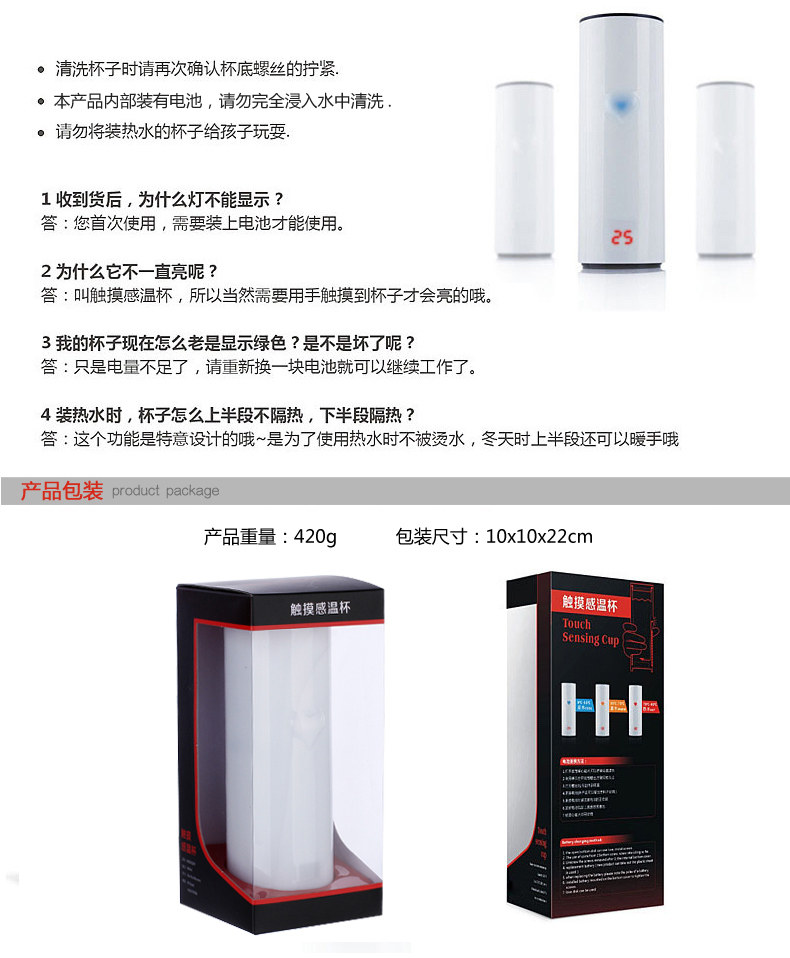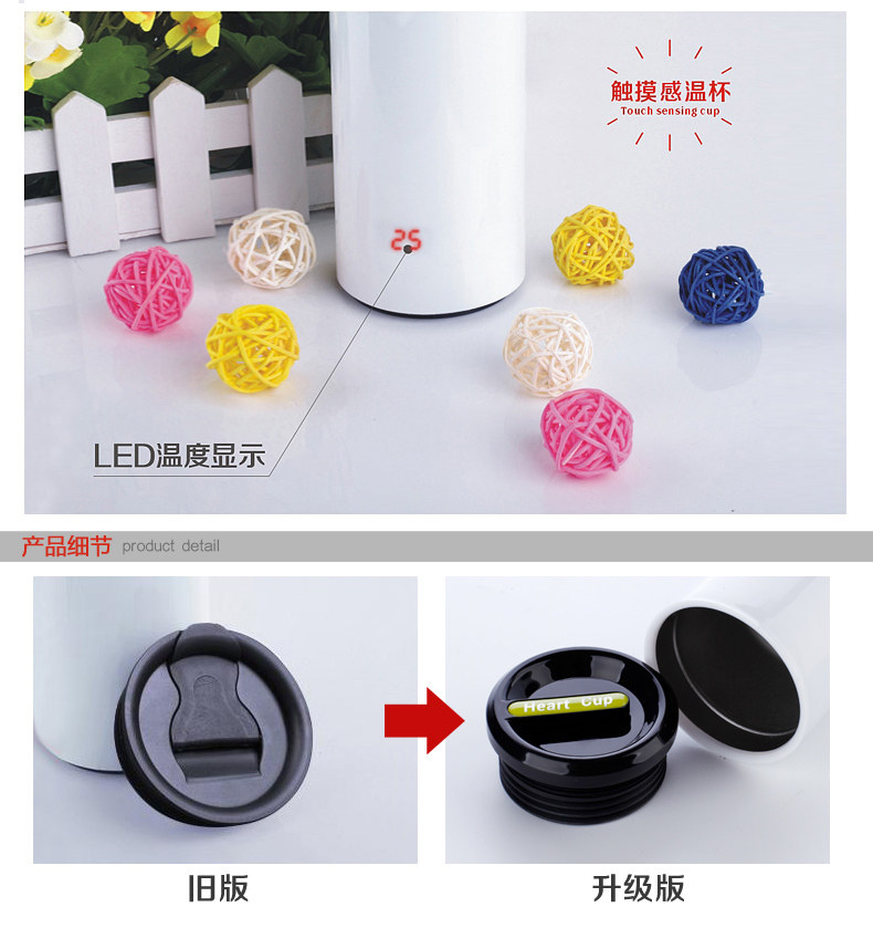 The cup design is simple, there is a very romantic name: Heart Tea. In addition to water, coffee, tea roses ... It also has a specific function! When you pick up the cup, the cup body protruding slightly heart-shaped flashes charming color! With a different cup of water temperature, heart-shaped total will be issued in three different colors: red represents passion boiling, orange is tepid, blue is a low-key look cool! Blue indicates water temperature is 0 to 35 degrees; orange, indicating that the water temperature is 35 to 75 degrees; red indicates a temperature above 75 to 90 degrees, to remind you to drink slowly, otherwise it will burn the mouth! Usually on the table, not heart-shaped light, only when the hand is in contact with the cup until the water temperature according to the cup shows the corresponding color.
