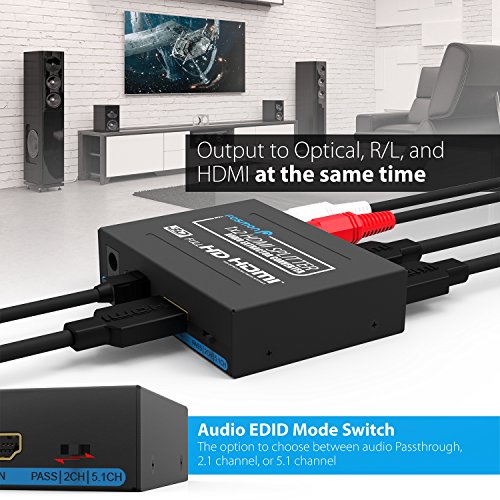 Audio can be extracted from the input device and connected to a separate audio system, such as an amplifier, soundbar, or receiver, via optical Toslink (S/PDIF) and RCA ports. Full surround sound and uncompressed audio formats are supported.