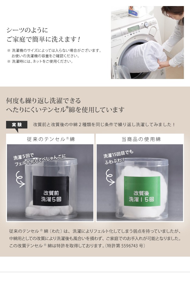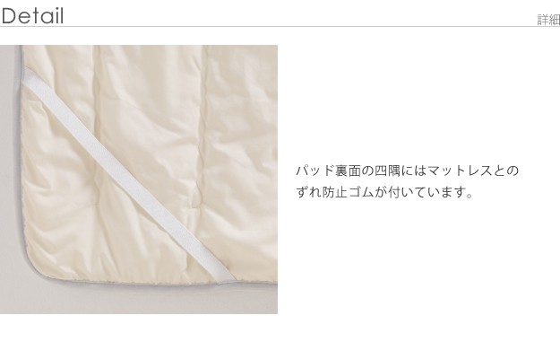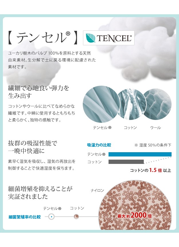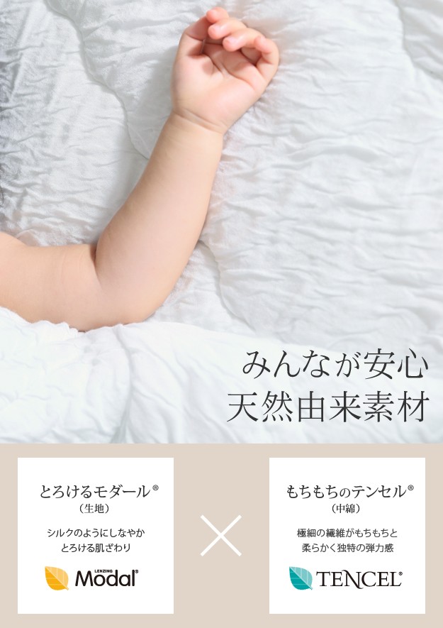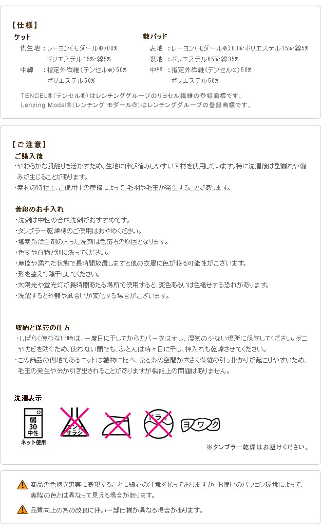 材質:ケット側生地-レーヨン80%・ポリエステル15%・綿5%、ケット中綿-テンセル50%・ポリエステル50%、パッド表地-レーヨン80%・ポリエステル15%・綿5%、パッド裏地-ポリエステル65%・綿35%、パッド中綿-テンセル50%・ポリエステル50%