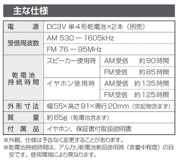 | ワイドFM(FM補完放送)対応の高感度ラジオ。最大135時間持続の電池長持ちタイプです。ラウンドフォルムで持ちやすく、コンパクトだから携帯に便利!同調ランプが光ります。FMロッドアンテナ・モノラル受信・スピーカー搭載・イヤホン付属。 |