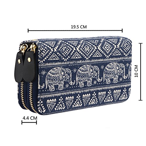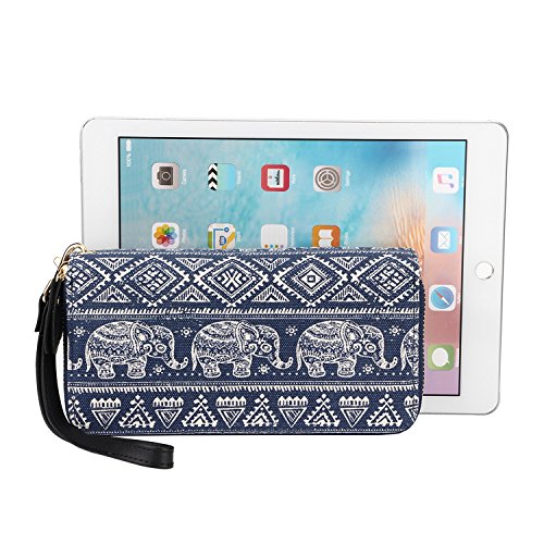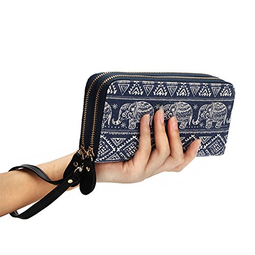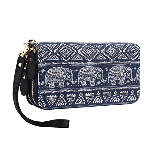 Women Wallet Zip Around Bohemian Purse Canvas Wallet Elephant Pattern Long Clutch Phone Card Handbag with Strap Coin Pocket