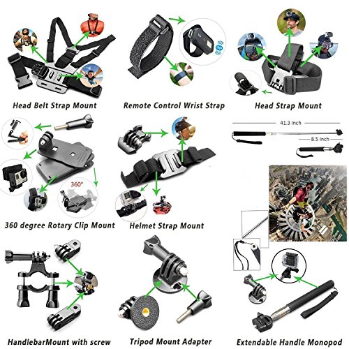 Compatible with: This is an Ultimate Combo Kit for GoPro HERO 5 Session 4 3+ 3 2 1 Black Silver/Sj4000/Sj5000/Sj6000/DBPOWER /AKASO/Canany/Lightdow/SJCAM/ APEMAN/Campark/WiMiUS/Cymas/CONNTECHS/ICONNTECHS/VTech Kidizoom/ SOOCOO/GARMIN VIRB/ODRVM/Xiaomi Yi 2/4K Action Video Cameras.