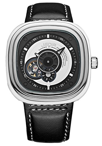 GuTe Mechanical GuTe출품 손목시계 맨즈 자동 감기 기계식 스퀘어 페이스 크로노그래프 가죽 밴드 유니크 화이트