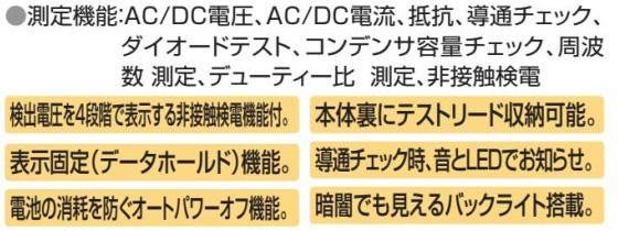fk094igrjs検出電圧を4段階で表示する非接触検電機能付本体裏にテストリードを収納することができますサイズ個装サイズ:20×12×3cm重量個装重量:160g付属品LR44アルカリボタン電池×2個(テスト用・本体に内蔵)製造国中国多機能&携帯に便利な薄型ボディ!検出電圧を4段階で表示する非接触検電機能付本体裏にテストリードを収納することができます