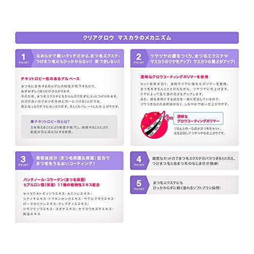 ●商品説明:まつ毛エクステ・つけまつ毛・素まつ毛・マスカラコートに使用でき、ツヤをあたえてバラついたまつ毛もキレイにととのえる透明マスカラです。お湯で簡単オフ可能。傷みがちなまつ毛にうるおいをあたえ、すこやかなまつ毛に導きます。ヒアルロン酸・コラーゲン・パンテノール・11種の植物性エキス配合。まつ毛にやさしく塗れるソフトブラシを採用しています。無香料。