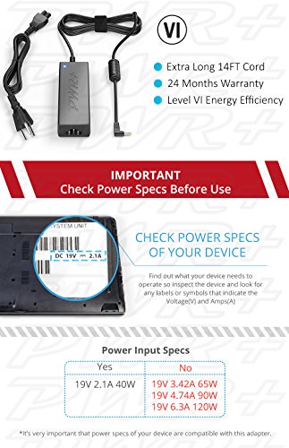 POWER SPECS : Output Max: 19V 2.1A 40W / Input Volt Range: 110-240V / Original Asus Charger Laptop AC Adapter Power Cord Replacement by PWR+