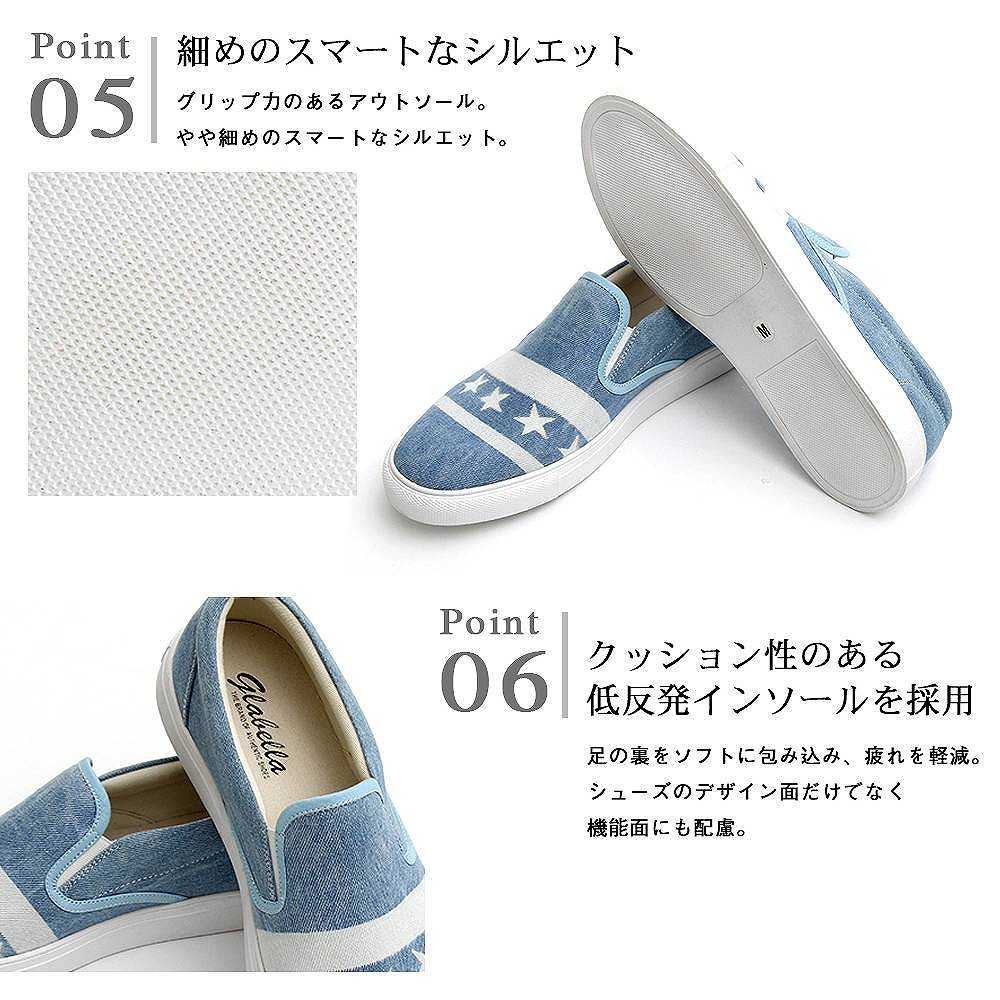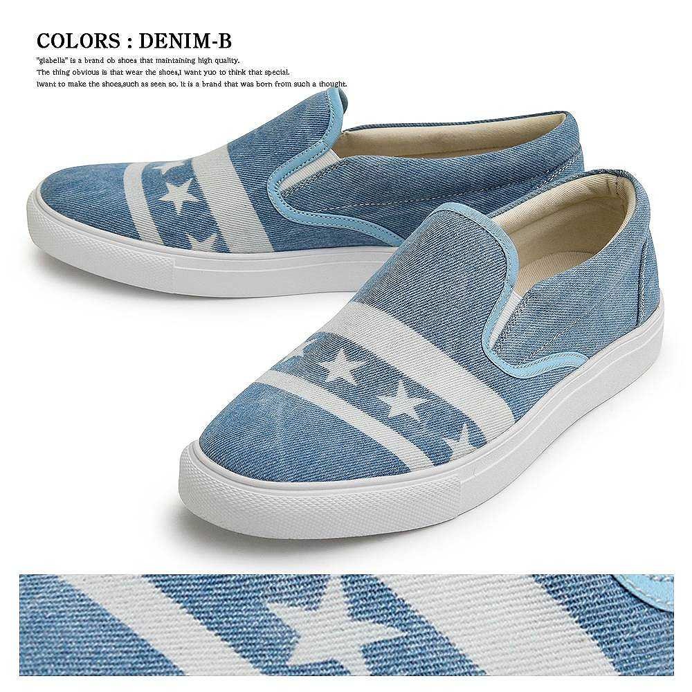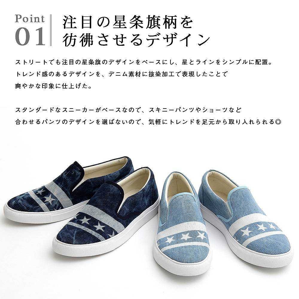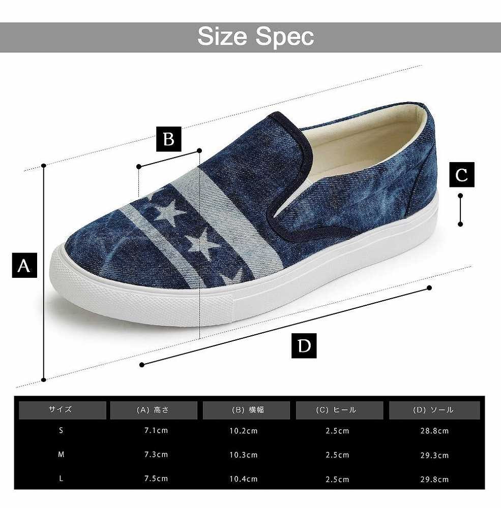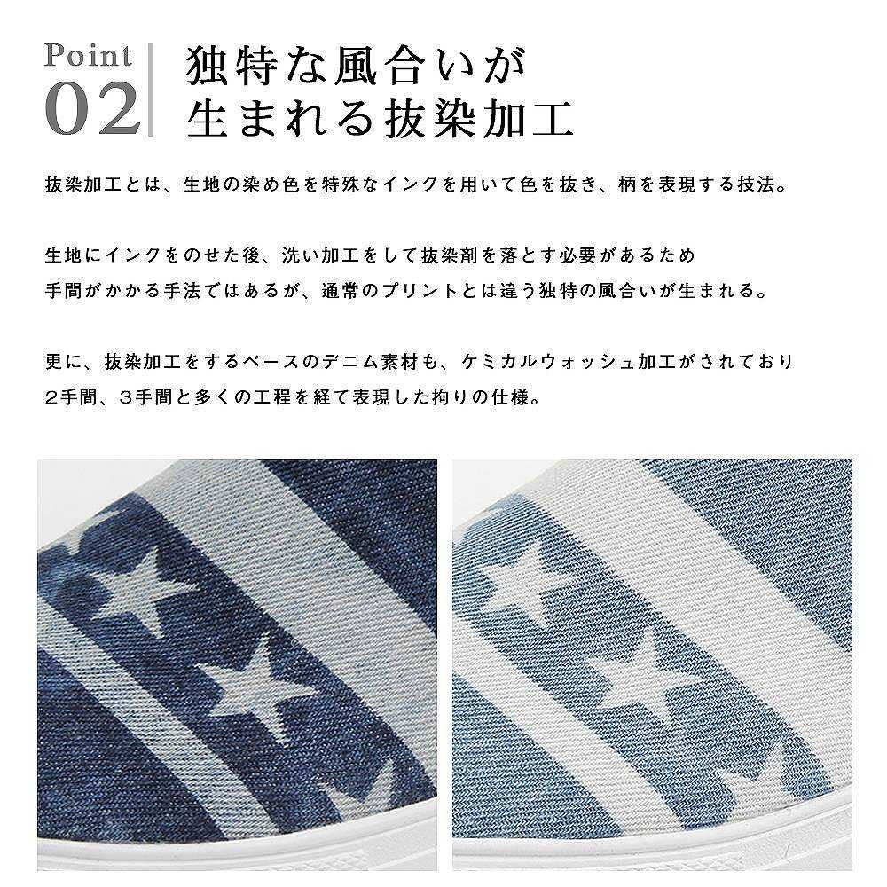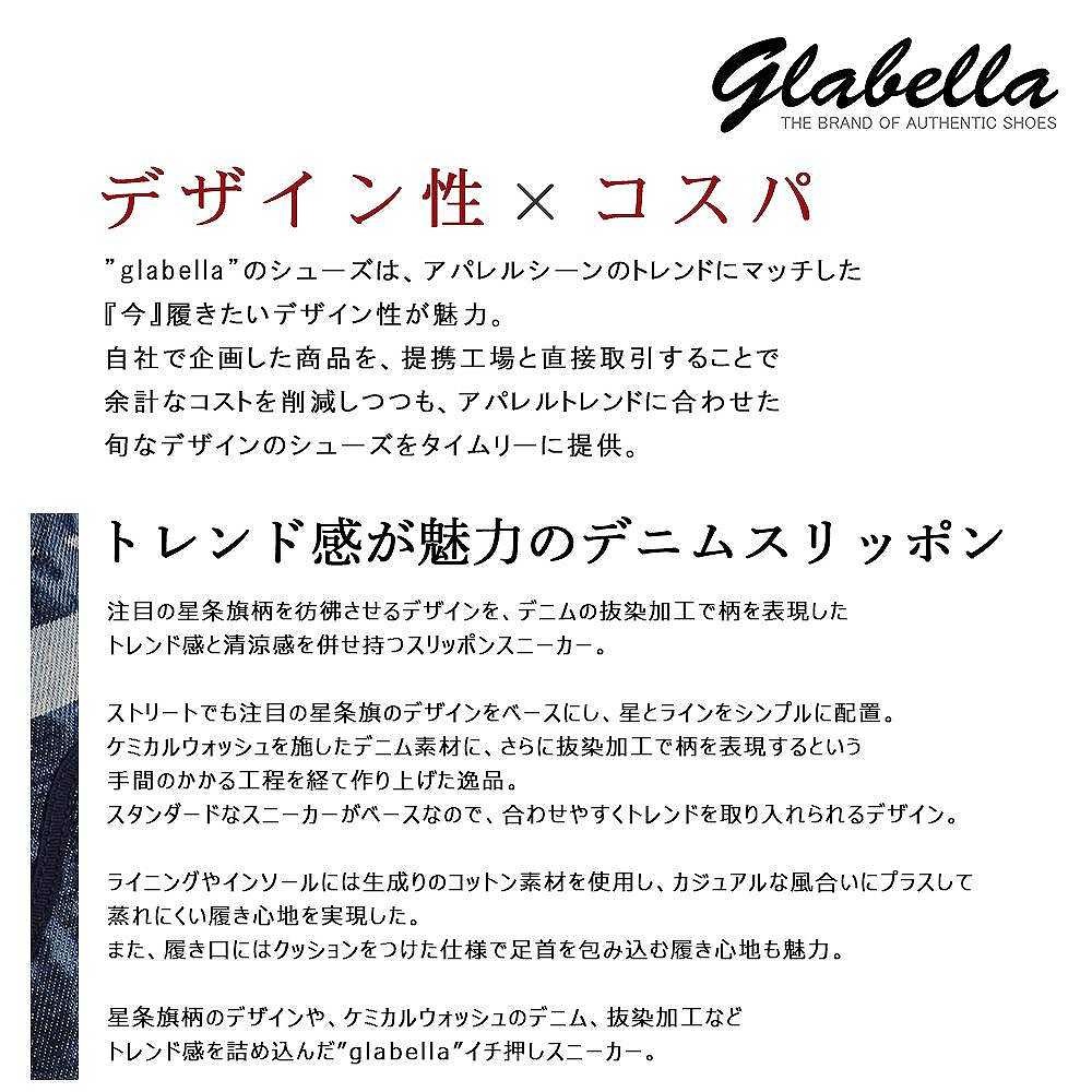 【商品説明】"トレンド感が魅力のデニムスリッポン"注目の星条旗柄を彷彿させるデザインを、デニムの抜染加工で柄を表現した、トレンド感と清涼感を併せ持つスリッポンスニーカー。ストリートでも注目の星条旗のデザインをベースにし、星とラインをシンプルに配置。ケミカルウォッシュを施こしたデニム素材に、さらに抜染加工で柄を表現するという手間のかかる工程を経て作り上げた逸品。スタンダードなスニーカーがベースなので、合わせやすくトレンドを取り入れられるデザイン。ライニングやインソールには生成りのコットン素材を使用し、カジュアルな風合いにプラスして、蒸れにくい履き心地を実現した。星条旗風のデザインや、ケミカルウォッシュのデニム、抜染加工など、トレンド感を詰め込んだ"glabella"イチ押しスニーカー。【サイズ】S (25.0cm-25.5cm)M (26.0cm-26.5cm) L (27.0cm-27.5cm)【素材】アッパー/天然繊維 化学繊維ソール/合成ソール【生産国】中国