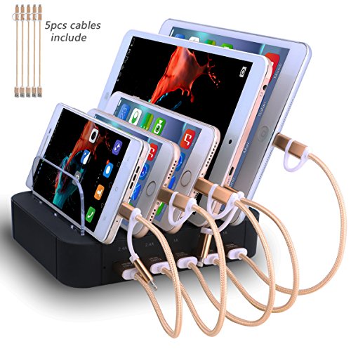 -. Feature : 1 charging station for all devices: 5 usb charging ports can charge up to 5 devices simultaneously. A wonderful space-saving charging station allowing us to use a small amount of space to charge up to five devices at one time in one place with the cords together. An integrated charging station keeps all your devices organized! / Smart Charging: There are 5 powered usb ports (2 x 2.4A, 3 x 1A) to choose from for charging. All ports can automatically identify different devices, every port can charge your device. And you can choose the 2.4A ports to use for the items you need charged the fastest. / Universal compatibility: This multi-port usb charging station can work with any usb device, rapid charge your favorite usb-powered mobile devices: ios & android smartphones (including the new iphone7/7 plus), tablets, cameras, smartwatches, ereaders, bluetooth headsets & speakers, wearables & more. / Innovative design: 6 removable baffles are mounted on the rugged base, you can decide which baffle be left then you have enough space to fiddle with the posture of your devices, lying flat or sideways to charge. / Steady and safety: FCC, CE Certified. 100% premium copper wire, built-in surge protection, over-voltage, over-current and short circuit protection with premium circuitry.