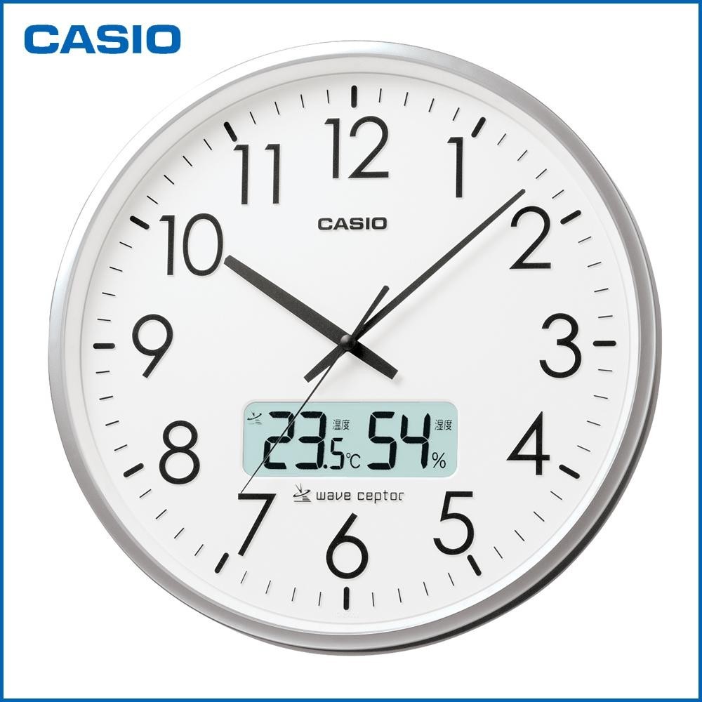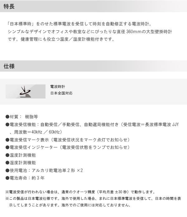 「日本標準時」をのせた標準電波を受信して時刻を自動修正する電波時計です。 製造国:中国 素材・材質:樹脂等 商品サイズ:H360×W360×D54mm 重量:1500g 仕様:使用電池:アルカリ乾電池単2形×2(付属) 付属品:アルカリ乾電池単2形×2、取扱説明書、保証書(保証期間:ご購入日より1年間) ※サプライヤー直送品 ご注文後3~4営業日後の出荷となります【商品名】CASIO カシオ 壁掛け時計 オフィス IC-2000J-8JF 湿度計 温度計付き 電波時計
