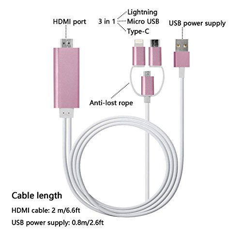 How to use: 1. Connect HDMI end to TV/Projector/Monitor's HDMI port, and connect lightning/micro USB/type C port to your phone 2. Connect an external 5V/1A(ipad need 5V/2A) adapter with USB end to power up this cable, note that power bank is not enough to make it works 3. For IOS: connect the phone and click"Trust" can be used directly; For android devices: please turn on USB debugging firstly.