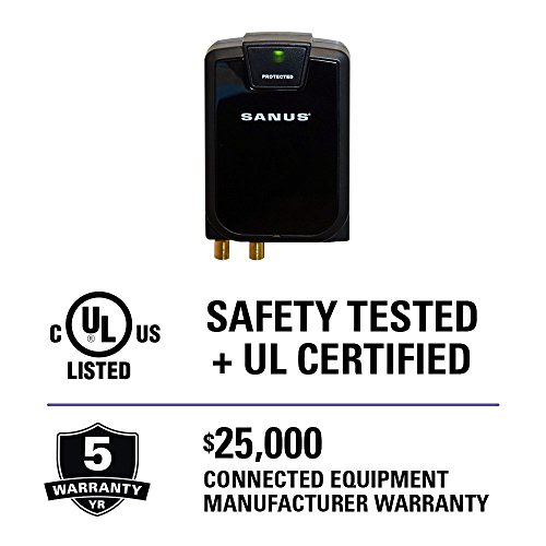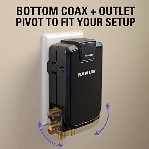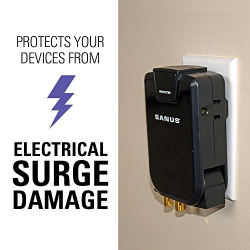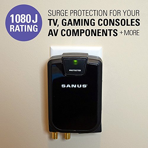If your looking to protect your AV equipment from dangerous power surges, you've come to the right place. This surge protector is loaded with features and is a great addition to any AV setup. With great surge protection specs and signal filtering, you'll get the best performance from your electronics, and peace of mind with our 5 year $25k connected equipment warranty. Now instead of worrying about lightning destroying your new TV, you can enjoy that 4k beauty. So what sets this surge protector apart? First off, it combines AC outlet coax ports into one small form factor so you can power and protect all your devices. One of the 3 AC outlets the coax ports can swivel, so you'll have no problem getting bulky power adapters hooked up. Second, our surge protection components are encased in ceramic, which makes them fireproof. Cheap surge protectors are still susceptible to fire during huge power surges. With SANUS, you don't need to worry about that. This product is UL safety certified to protect your equipment. Another bonus feature is the noise filtering. Appliances in your home produce interference in your power supply, which makes power "dirty". Devices can't perform at their best and lose lifespan when connected to dirty power. By filtering it through our surge protector, you'll eliminate this dirty power. The Specs - 1080J surge protection