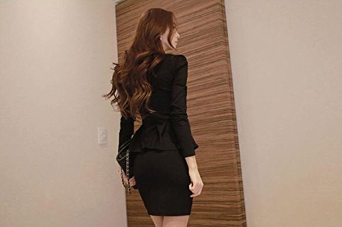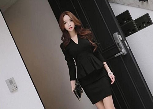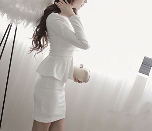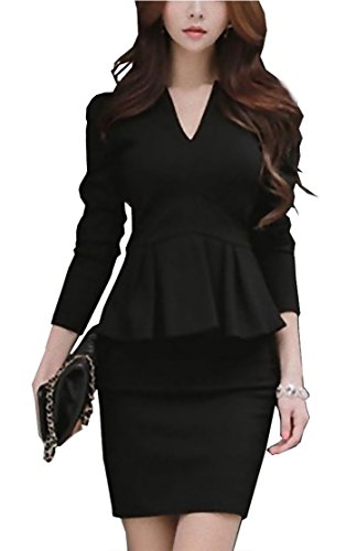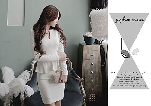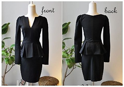 -. Feature : シルエットが綺麗なペプラムデザインのVネック長袖ワンピース。スーツのようなフェイクレイヤードスタイル♪ / ペプラム風ウエスト部分から広がる飾りフリルがスタイルをキレイに見せてくれます。 / オフィスやパーティでフォーマルにも着られるワンピアイテムです。 / カラー : ブラック / ホワイト      サイズ : M、L、XL / 素材 : 混紡コットン