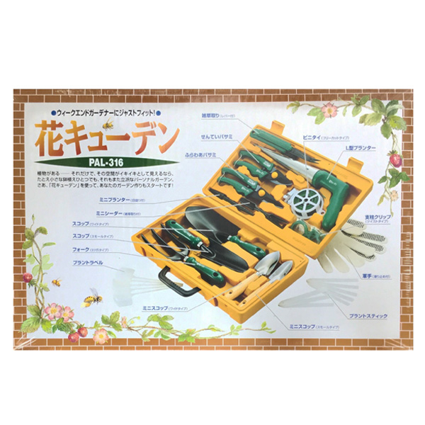 ●外箱には各工具の説明の他に、土作りから水やりのタイミング、肥料のノウハウなどのコメントが記載されており、ビギナーにはとても便利なツールセットです。