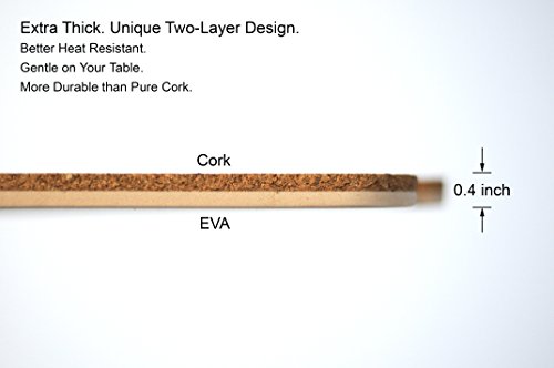 UNIQUE TWO-LAYER DESIGN: Our trivet has two layers. The top layer is cork while the bottom layer is EVA, a material often used as cushioning in running shoes. They not only offer gentle touch to your table, but also make the trivet more durable compare to pure cork products.