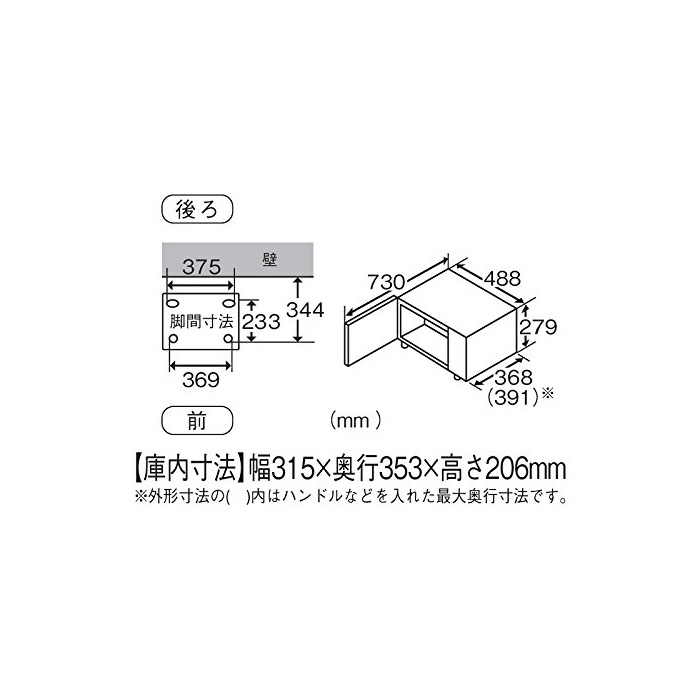 치수:폭488×(길이)깊이368(※핸들 등을 만들어 넣음(담는 그릇·상자 등) 최대(길이)깊이치수:391mm,도어 개방시의(길이)깊이치수:730mm※)×높이279mm