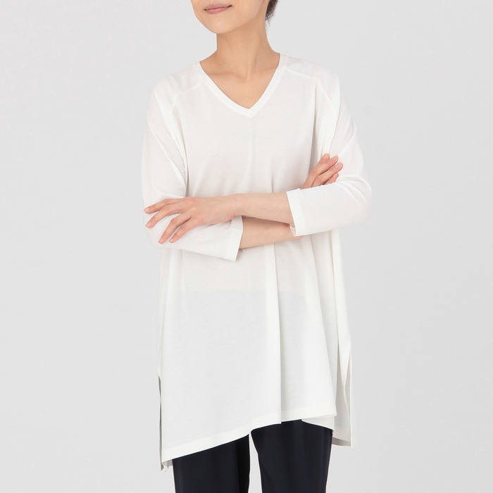 원본상품명: 綿混ストレッチVネック七分袖チュニック 婦人ONE SIZEカキベジュSALE