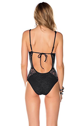 Product DescriptionCrochet one piece plunge with removable soft cups, sheer insets, and adjustable straps. Ties at back.0