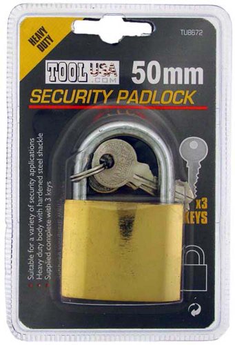 -. Brand : ToolUSA -. EAN : 0886461172490 -. Feature : This 50mm Brass security padlock is one relaible lock weighing 8 Oz / Comes with 3 Steel keys - extra keys for the family / The shackle is extra strong made out of Hardened Steel for increased security - Resists cutting / Brass pin tumbler cylinder for a long lasting, smooth working action / Dual Lever locking mechanism for increased security -. Label : ToolUSA -. Manufacturer : ToolUSA -. MPN : B00VUGQYNA -. PartNumber : B00VUGQYNA -. ProductGroup : Home Improvement -. ProductTypeName : SECURITY_ELECTRONICS -. Publisher : ToolUSA -. Studio : ToolUSA -. Title : ToolUSA Toolusa Heavy Duty 50mm Security Padlock With 3 Keys: TU8672 -. UPC : 886461172490